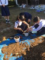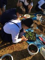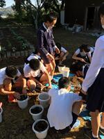 植替えるくらいに育ったので、今日6年生の子供達が鉢に苗を植え替えてくれました。