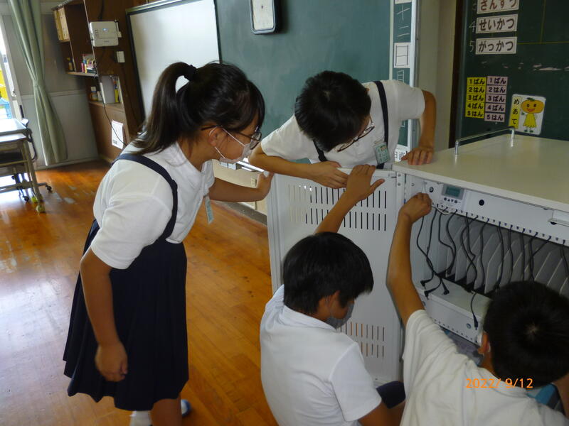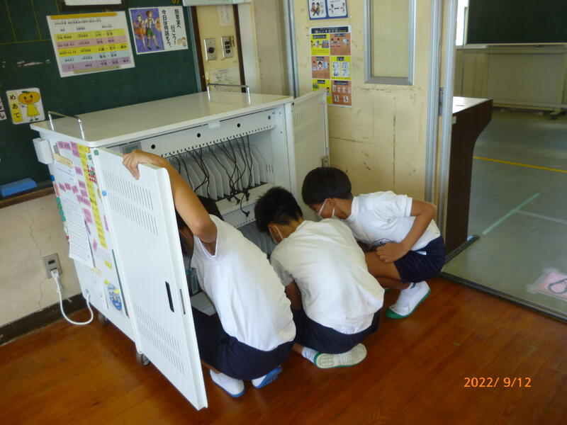 アダプターは、タブレットPC保管庫に接続してあり、簡単には外すことができません。そこで、5,6年生の児童に「アダプター外し隊」を募集しました。「アダプター外し隊」の任務は、1,2,3年生のアダプターを外して持ち帰りができるようにすることです。担任が、呼びかけをするとすぐにメンバーが集まりました。