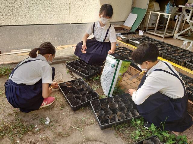 育苗ポットに土を入れ、種を2、3粒ずつ丁寧にまいていきました。作業をしていくうちに世話をするチーム名を考えることにしました。子供たちからは、いろんなアイデアが出ましたが、最終的には「フラワーガールズ」と決まりました。男子児童が参加したら、名前をまた考えるそうです。