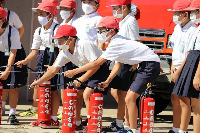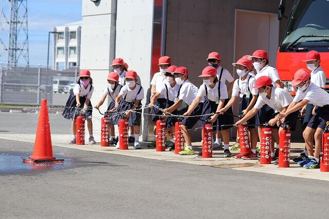 水消火器による消火訓練もしました。通常の消火器の消火剤が15秒しか出ないと説明を受け、子供たちは集中力を高め、消火体験をしました。緊張感を持ち、ねらいを定めて火点に想定した的へ見事に当てることができていました。