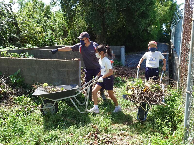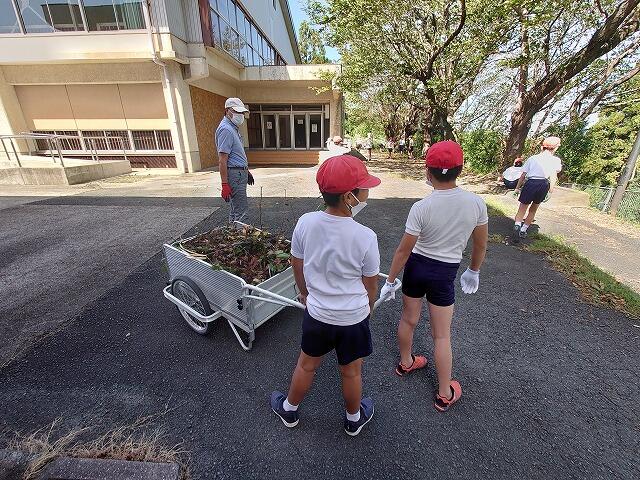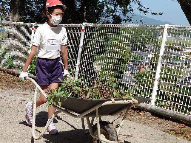 さて、学校では全児童と全職員でミニ愛校作業をして、台風の片づけや復旧を行いました。校地には、前回の台風以上にたくさんの枝や葉が散乱していました。大人の背丈よりも長くて太い枝も落ちていました。しかし、子供たちは前回の経験を生かし、手際よく作業を進めていきました。各ご家庭からは、軍手などを準備持たせていただきありがとうございました。子供たちが安全に作業できました。
