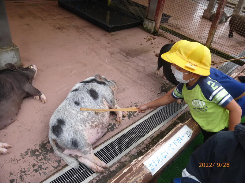 ブタのマッサージでは、用意してある棒を使って、背中やおなかを優しくこすってあげました。すると、ブタは気持ちよさそうにして、自分からこすってほしい体の部分を子供たちに向けて「もっと、もっと!」と催促してきました。動物にも優しい1年生でした。