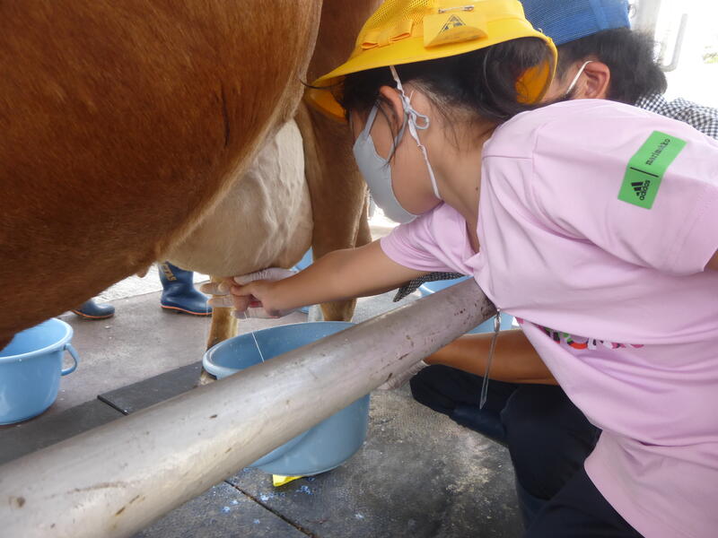牛の乳しぼり体験では、係員の方の説明をしっかりと聞いてチャレンジしました。子供たちは、はりきってチャレンジしましたが、最初はなかなかうまくいきませんでした。しかし、コツをつかむと勢いよく牛乳がバケツに入っていきました。子供たちは目を丸くして大喜びでした。成功するまであきらめない根気強い1年生でした。