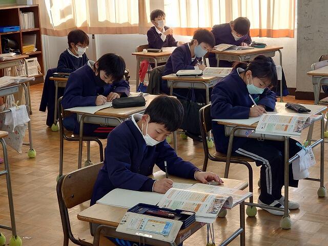 6年生では、算数の復習をしています。分数の掛け算や割り算を復習していました。約分を見落としてしまうミスが見られましたが、気をつけるように声をかけると、あっという間に改善していきました。鉛筆の音だけがコツコツと響く6年教室。みんなもうすぐ中学生です。進学する準備が着々と進んでいます。