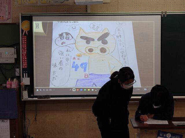 1月12日、6年生教室のスクリーンに49日と大きく書いてあるカレンダーが投影されていました。