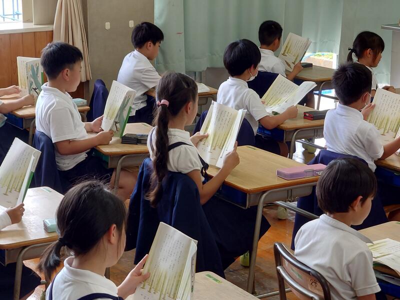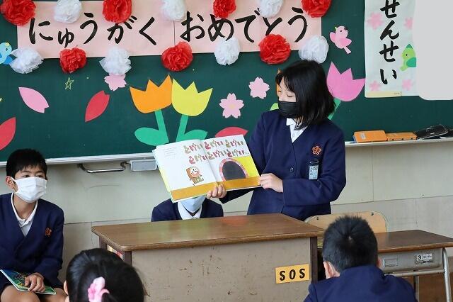 入学式後には、保護者の方対象に学校生活に関する説明会を行いました。その間、新入生は教室で6年生による絵本の読み聞かせを楽しんでいました。