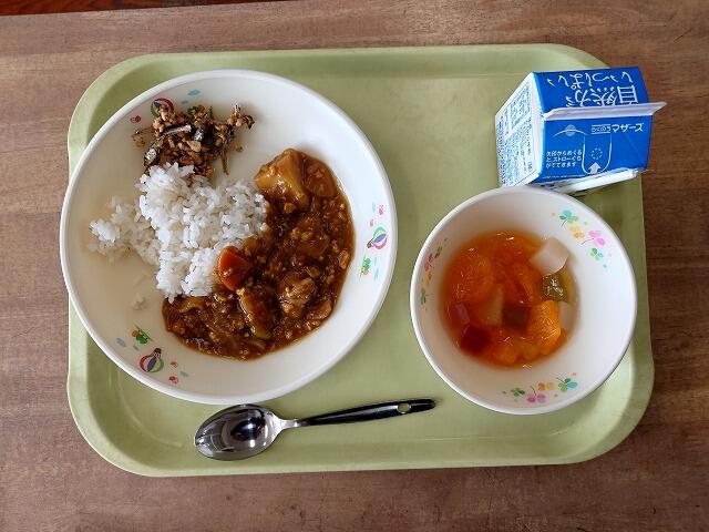メニューは、カレーライスといりこのごまがらめ、フルーツミックス、牛乳でした。