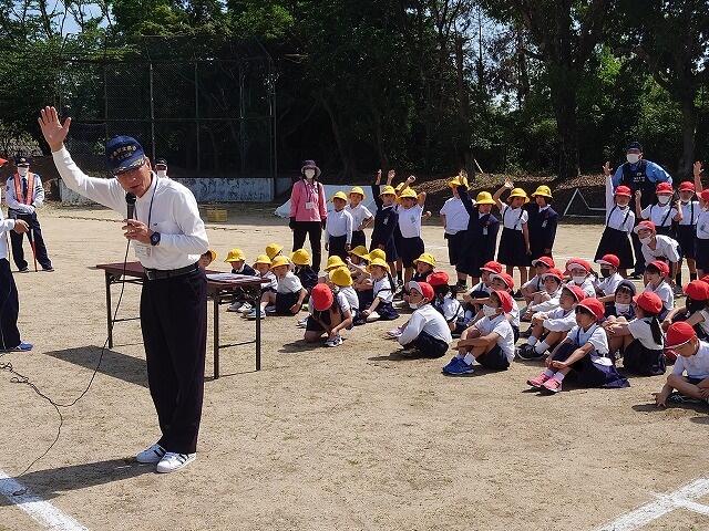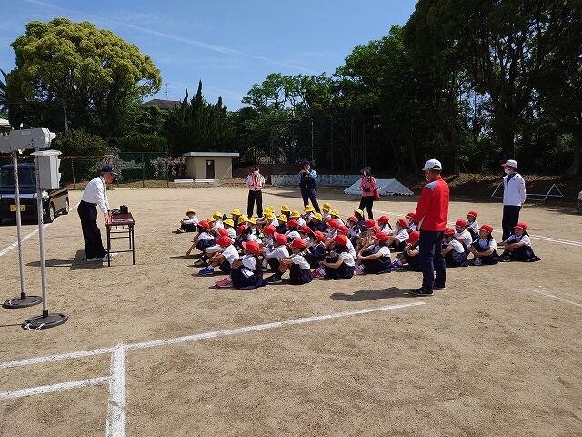5月10日、交通教室を運動場で実施しました。外部からの応援として、玉名警察署交通安全協会、玉名市防災安全課・交通防犯係の方々が参加してくださいました。
