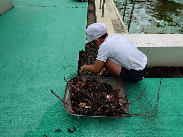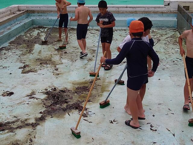 プールサイドの溝には、たくさんの落ち葉が積もっていました。子供たちは丁寧に取り除いていきました。また、プールの床や側面の汚れをデッキブラシなどを用いて、隅々まで掃除をしていきました。