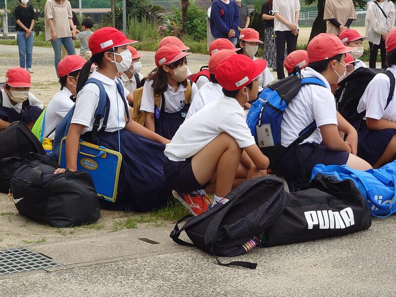 子供たちは、地震対策として机の下にもぐり、避難中は頭を教科書などで守りながら移動しました。