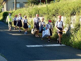 夏休みが終わったとは言え、まだまだ暑さが続いています。それでも子供たちは、民生委員や交通指導員の皆さんに見守られながら、たくさんの道具をもって、たくましく登校していました。