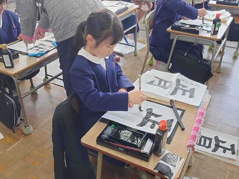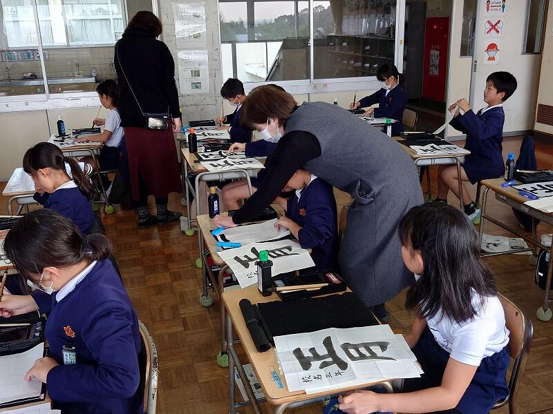 外部からお二人の方に来校していただき、専門的なご指導をいただきました。墨をたっぷりと使うこと、筆は立てて使うこと、文字のバランスなど一人一人に丁寧にご指導いただきました。