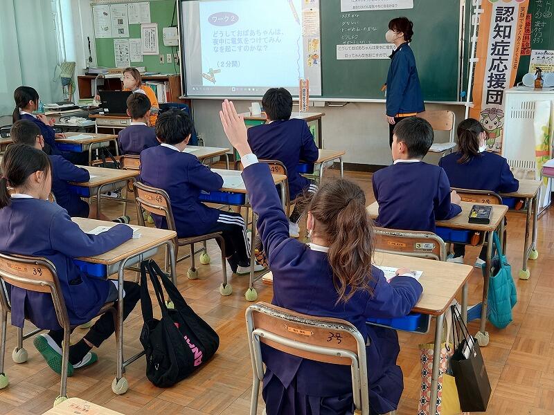 自分の家族が認知症になった場合を想定して学習が進みました。子供たちは、何に気をつけるとよいか、どのように行動をとればいいのか等を真剣な表情で考えていました。
