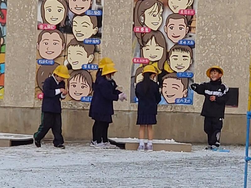 登校して来た子供たちは、雪玉を作ったり、雪合戦をしたりしていました。中には、竹ぼうきや松葉かきを利用して雪を集める子もいました。