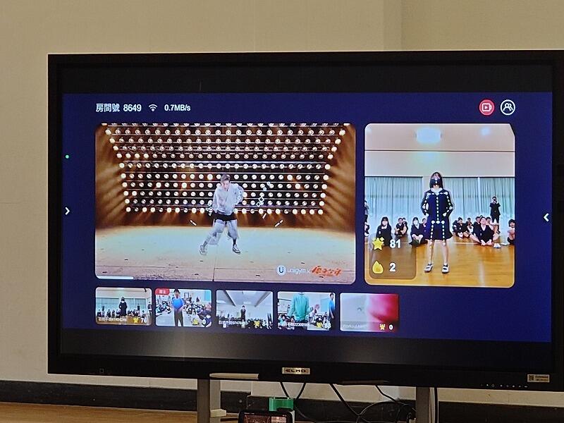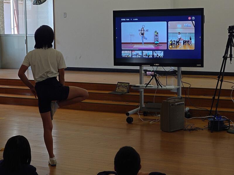 後半では、エクササイズを正確にまねをするゲームに代表の児童が挑戦して、得点を競い合いました。