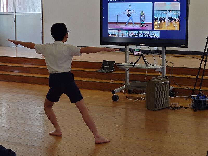 体育交流では、エクササイズの動画を見ながらまねをするゲームをしました。エクササイズは、ヨガのようなゆっくりとした動きのものやヒップホップダンスのようなものがありました。