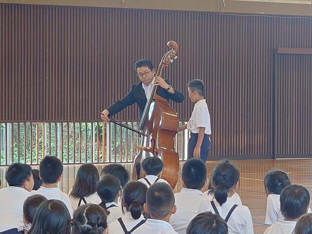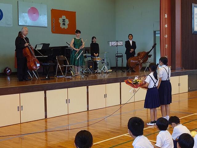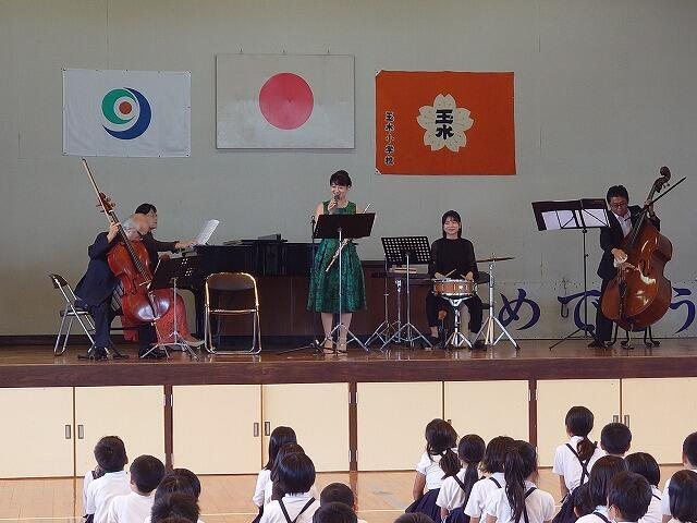 10月3日、「玉名市音楽アウトリーチ事業」のご支援をいただき、芸術鑑賞会を開催しました。内容は、「リヴィエール」さんによるフルートやピアノ、コントラバス、チェロ、パーカッション(シンバル、小太鼓、ウッドブロックなど)の楽器によるアンサンブルコンサートでした。