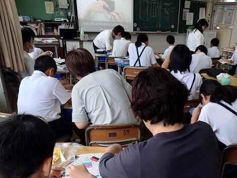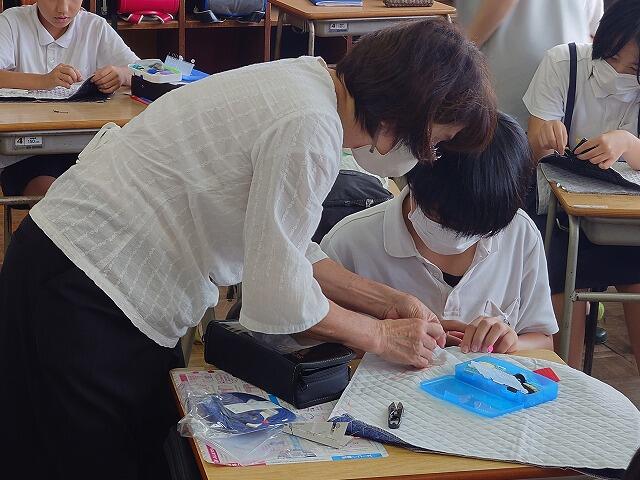 6年生の様子を見ていると、針孔に糸を通すことや玉止めに手こずることあちらこちらにいましたが、地域の方々のおかげでとても助かりました。
