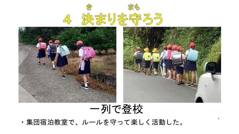 一列になって安全に登校できている班がいくつもあります。後ろから来た車にきづかない場合でも安全です。この姿を手本に、一列での登校を後期もしてほしいと思います。