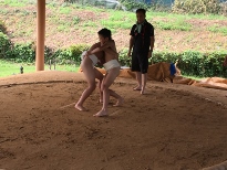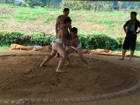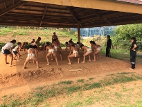 7月26日(水) 相撲の練習を紹介します。最初は四股、すり足の基礎練習、ぶつかり稽古、対戦、団体戦という流れで練習がありました。
