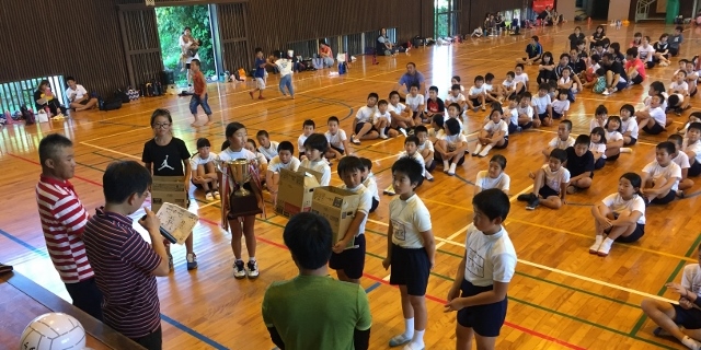 8月20日(日) 9:00~さわやかレクレーションがありました。朝の美化作業に続けてなのに、子ども達も保護者の方も元気に参加されていたのに驚きました。皆さん本当にタフです。活動は、とても和やかに進み、笑いあり、真剣な表情ありと大変盛り上がりました。本当に皆様お疲れ様でした。優勝は竹崎・野部田地区で三連覇を達成されました。おめでとうございました。