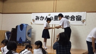 9月4日(月) 通学合宿2日目です。南坂までマイクロバスのお迎えがありました。体調を崩す子どもはいませんでしたが、みんな少し疲れ気味です。(写真上)16時からは、閉講式がありました。代表で佐々木未空さんが、修了証を受け取りました。その他、班長さんが記念品を受け取りました。貴重な体験と思い出ができたと思います。周りでお世話をしていただいた、関係者の方に感謝の気持ちを忘れないでほしいと思います。写真は、閉校式まえのくつろいだ状態と閉校式の様子です。