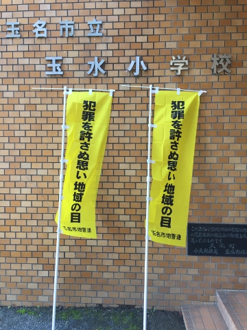 10月23日(月) 先週のことになりますが、玉名市地域警察連絡協議会(地警連)より、子ども達を犯罪から守るために「犯罪を許さぬ思い地域の目」と書かれた旗を2本頂きました。活用させていただきます。ありがとうございました。