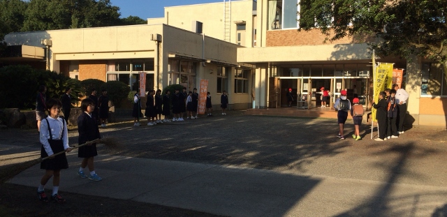 10月26日(木) 朝 天水中学校との「合同あいさつ運動」の2日目です。やはり子ども達は、中学生の前を通るとき、照れや緊張があるようで、いつもの元気の良いあいさつには、まだまだです。少し慣れてきた子どももいますが、もうひとがんばりです。