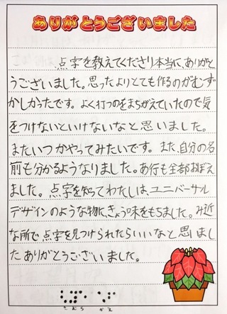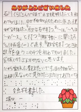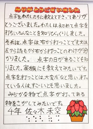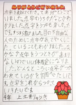 12月13日(水) 2校時 玉名学探究「点字を体験しよう」の授業がありました。4年生は、教科間連携で「共感力」を育成するために玉名学探究を中心にして学習を進めています。地域人材活用と感謝の気持ちを伝える目的で、指導していただいた福祉協議会の穴井さんにお礼の手紙を書きました。4名の児童の感想を紹介します。