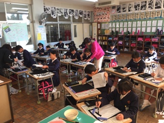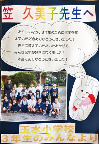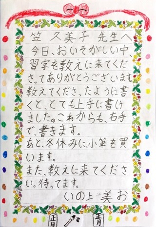 12月21日(木)に、3年生の書写指導にゲストティーチャーとして、立花の笠久美子先生をお招きしました。3年生から書写指導が始まるので、専門的な指導をということでお願いしました。2時間の指導で子どもたちもずいぶん上達しました。その後、子どもたちは、お礼の手紙を書きました。