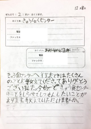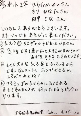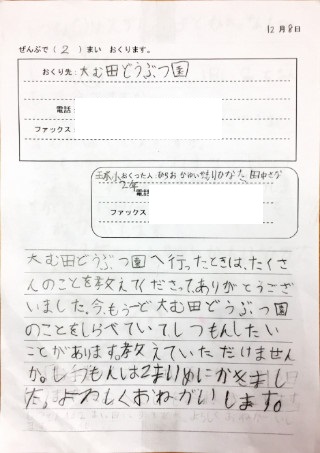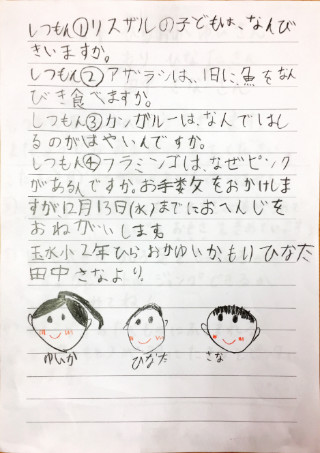 以前お知らせしました2年生の生活科の続報です。見学旅行等で質問して学習した後、また新たな疑問が出てきたので、FAXを利用して再度質問をしました。動物園や給食センター郵便局から、返事をいただき疑問を解消しています。写真は、給食センターと動物園とのやりとりです。