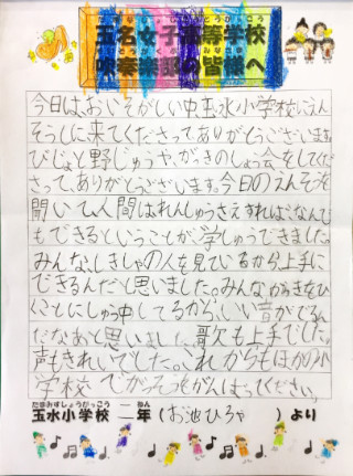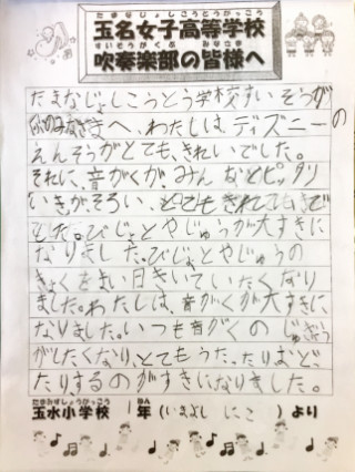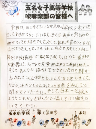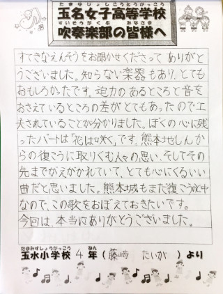 12月13日(水)に音楽鑑賞会を開催したことは、以前お伝えしていました。その後、全員がお礼の手紙を書きました。本校では、周りの人や出来事に感謝の気持ちを持ち、できるだけその気持ちを伝えることに取り組んでいます。音楽演奏のすばらしさについてはもちろんですが、チームワークの良さや熊本地震からの復興への思い、自分自身と重ねたところでの思いなどしっかりと受け止め感想を書くことができていました。その一部を紹介しいます。