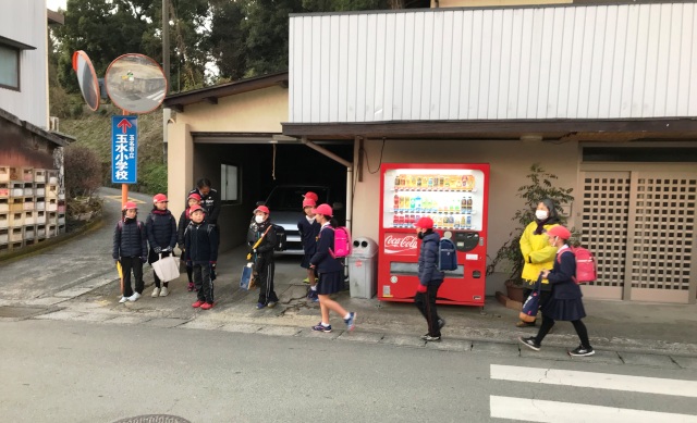1月10日(水) 南坂下の登校の様子です。寒い中、子どもたちは、元気に登校しています。ちらほら、遅れてきている子どももいます。集合時刻を守って登校できるよう頑張りましょう。南坂では、主任児童員さんに登校指導をしていただいています。