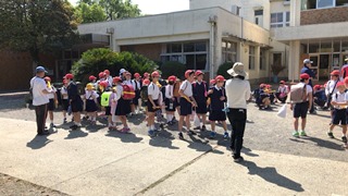 4月11日(水)今日は、一年生の初めての集団登校でした。上級生もお兄さんお姉さんとしてしっかりサポートしていました。交通指導員さん、民生児童員さん、主任児童員さん、学校職員で見守る中、安全に登校できていました。