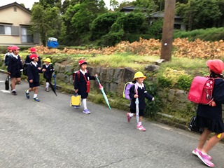 4月17日(火) 今日は、南坂方面の1年生の登校の様子です。重い大きなランドセルを背負ってちょっときつそうに歩いています。周りの上級生は、お世話をしながらちょっぴりお兄さんお姉さん気分を味わっています。今日は、一人1年生が転んで膝をすりむいてしまいました。上級生が手を引きながら連れて行ってくれました。