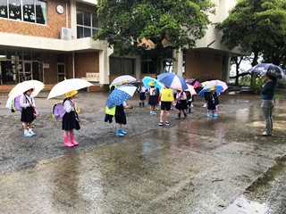 5月8日(火) 玉水小学校では、放課後子供達が帰るのに合わせて、保護者による防犯パトロールをしていただいています。いつも大変ありがとうございます。写真は、雨の中一斉下校をする子供達と防犯パトロールに向かわれる保護者です。