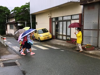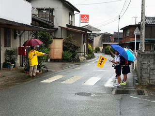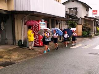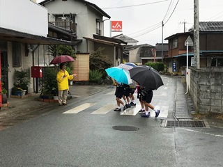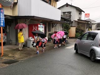 5月31日(木) 今日は、あいにくの天気で、小雨の中の登校でした。子供達は、かさを出して、しっかり左右を確認して渡っていました。雨の日は、より危険が増します。注意したい物です。