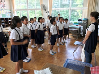 7月4日(水) 1校時4年生が玉名学探求で、ゲストティティーチャーに林田様をお迎えして、立花神楽について学びました。子供達は、真剣な表情でお話を聞き、おたずねをしていました。