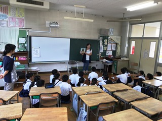 7月19日(木) 2校時、玉名学(探求)で、5年生が、戦争について学びました。ゲストティーチャーに山城様(荒尾二造変電所跡等をいかす市民の会所属:上土井君のおじいちゃんでもあります)をお呼びして、大浜飛行場(玉名市)のことを中心にお話をしていただきました。野部田にある法光寺に残された「日の丸寄せ書き」にも触れていただきました。大変ありがとうございました。