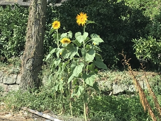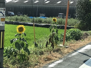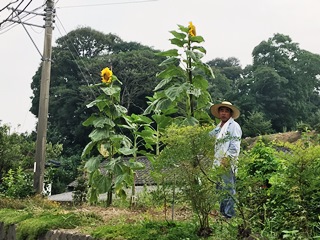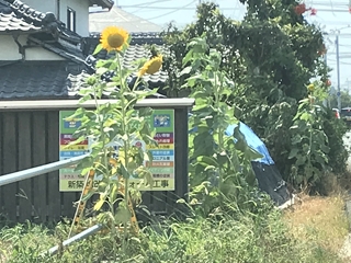 7月17日(火) 地域のひまわり一番大きくなっているひまわりの他、花が咲いたひまわりです。だんだん花が咲くのが増えてきているようです。