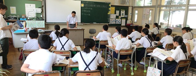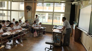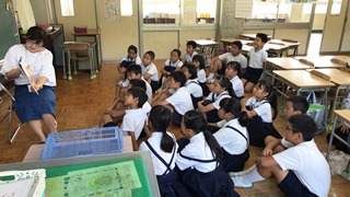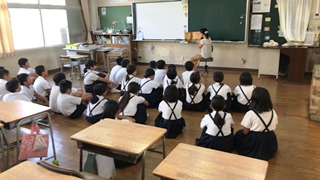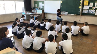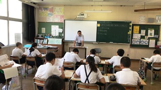 7月19日(木) 2校時、玉名学(探求)で、5年生が、戦争について学びました。ゲストティーチャーに山城様(荒尾二造変電所跡等をいかす市民の会所属:上土井君のおじいちゃんでもあります)をお呼びして、大浜飛行場(玉名市)のことを中心にお話をしていただきました。野部田にある法光寺に残された「日の丸寄せ書き」にも触れていただきました。大変ありがとうございました。