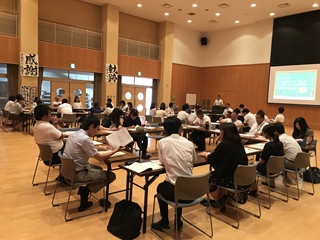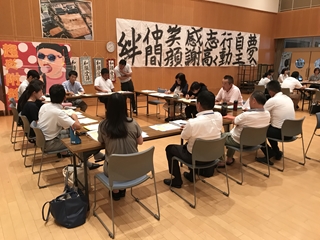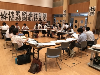 7月26日(木) 午後 天水中学校で、小中4校の職員が集まり小中一貫教育推進のための研修会がありました。保育園からの参加もありました。全体会と知徳体3つの部会に分かれ実態や重点取組事項について話し合いました。知の部会では、対話場面の活性化を重点取組とし、活性化した姿の共有を行いました。徳の部会では、学校内ではできるあいさつが、地域でうまくできていない実態から「いつでも、どこでも、誰とでも」のキャッチフレーズで地域の方へのあいさつを進めることになりました。体の部会は、外遊びの奨励の取組と柔軟性の強化をすることにまとまりました。写真は、その様子です。