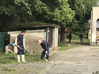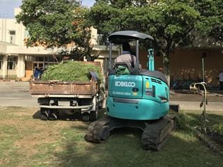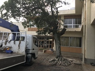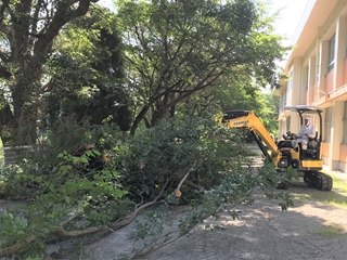 8月10日(金) 樹木伐採の続きです。理科室横の大きな木の枝と電源を管理している建物の中にあった2本の木も切ってもらいました。理科室が少しは明るくなるでしょう。また、電源管理の建物の屋根の腐食も防ぐことができると思います。