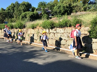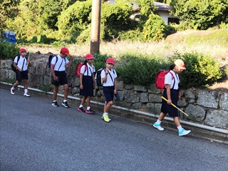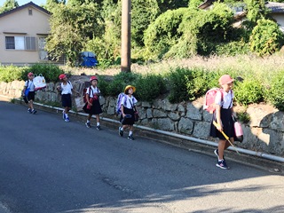 8月28日(火) 今日は南坂方面の登校の様子です。日陰は割と涼しいのですが、日向は、本当に暑いです。子供達は、よく頑張って登校しています。写真には写っていませんが、主任児童員さんに交通指導をしていただいています。南坂も北阪もいつもボランティアで交通指導に立っていただき大変ありがとうございます。