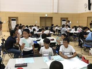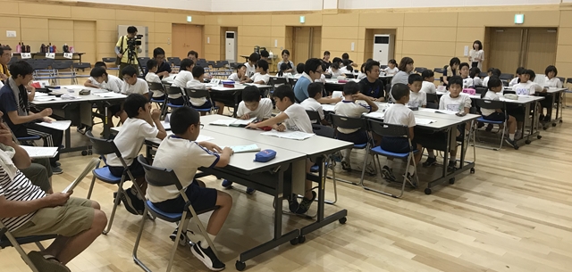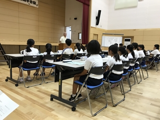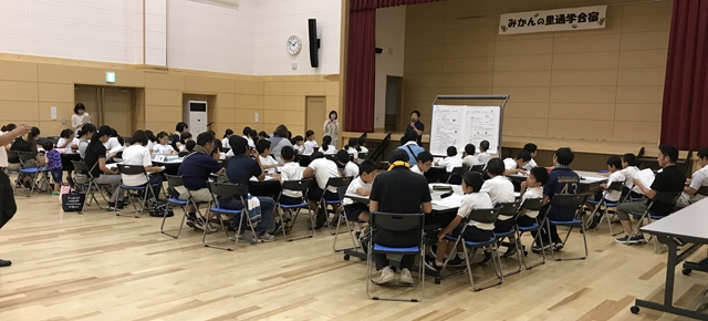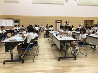 9月2日(日) 13:30~通学合宿の開講式が始まりました。写真は開講式の様子です。子供達は、注意や説明を聞いた後、目標を立て、自己紹介とその目標の発表を行いました。少し不安はあるようでしたが、友達と過ごすことをとても楽しみにしているようでした。