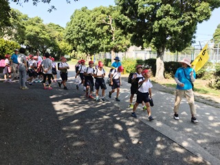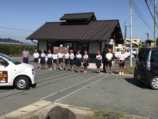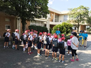 9月3日(月) 通学合宿で宿泊した4年生の子供達が、登校してきました。てんすい倶楽部までは、車でその後徒歩での登校です。民生児童委員の皆様に引率していただきました。