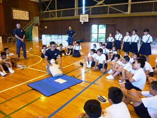 9月12日(水) 5年生、6年生が救急救命士と消防士をお呼びしての授業を行いました。内容は、命の大切さ、いじめによる自殺のお話、救急救命士としての役割と技術的な指導をしていただきました。子供達は、しっかり学んでいました。写真は、活動の様子です。