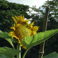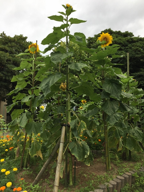7月16日(日) 3年生が植えた10本のひまわり、花が4つになりました。今まで草丈をリードしてきた一番高いひまわりも咲きました。残りのひまわりで、4mを目指しますが、ちょっと厳しいところです。