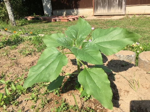 5月25日(木)のひまわりの写真です。ずいぶん大きくなりました。そろそろ一本仕立てにしないといけません。少しかわいそうな気もします。