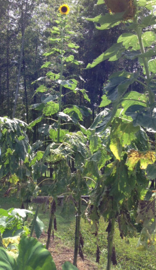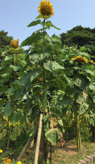 4月28日(土) 今年度2つのひまわり活動に取り組みます。一つは、昨年度からの計画である「ひまわりプロジェクト」です。もう一つは、昨年度3年生が取組んだ「ひまわりのせいくらべ」です。「ひまわりプロジェクト」は、学校農園、「ひまわりのせいくらべ」は、学校園がスタートととなります。写真は、右が昨年の「ひまわりのせいくらべ」で一番大きくなった3m57cmのひまわりです。左は、4年前に全国2位になった4m28cmのひまわりです。
